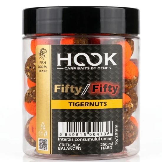Boiliesurile Hookbaits Critic Echilibrat Fifty Fifty Tigernuts 16/20mm sunt momeli premium dedicate pescuitului la crap, concepute pentru a oferi o prezentare naturala si o atractivitate ridicata chiar si in conditii dificile. Designul bicolor tip Fifty Fifty creeaza un contrast vizual puternic pe substrat, facilitand identificarea rapida de catre pesti si stimuland atacurile.